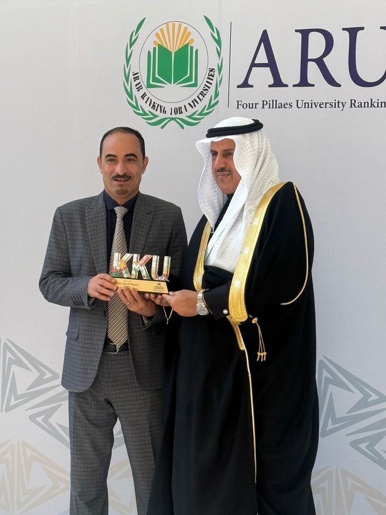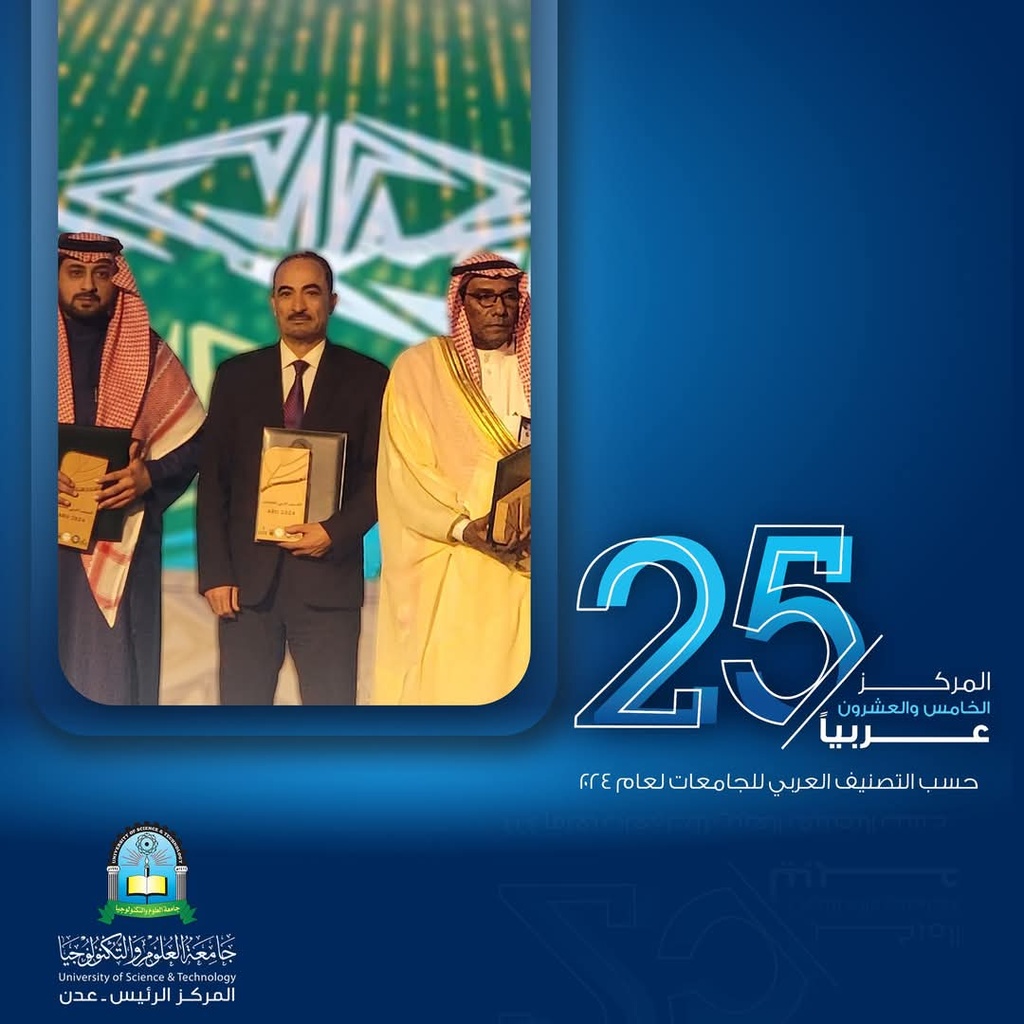 Professor Abdul Ghani Hamid Ahmed, President of the University of Science and Technology – Aden, receives the shield for the university's achievement of ranking 25th in the Arab world at the ceremony honoring Arab universities in Saudi Arabia.
